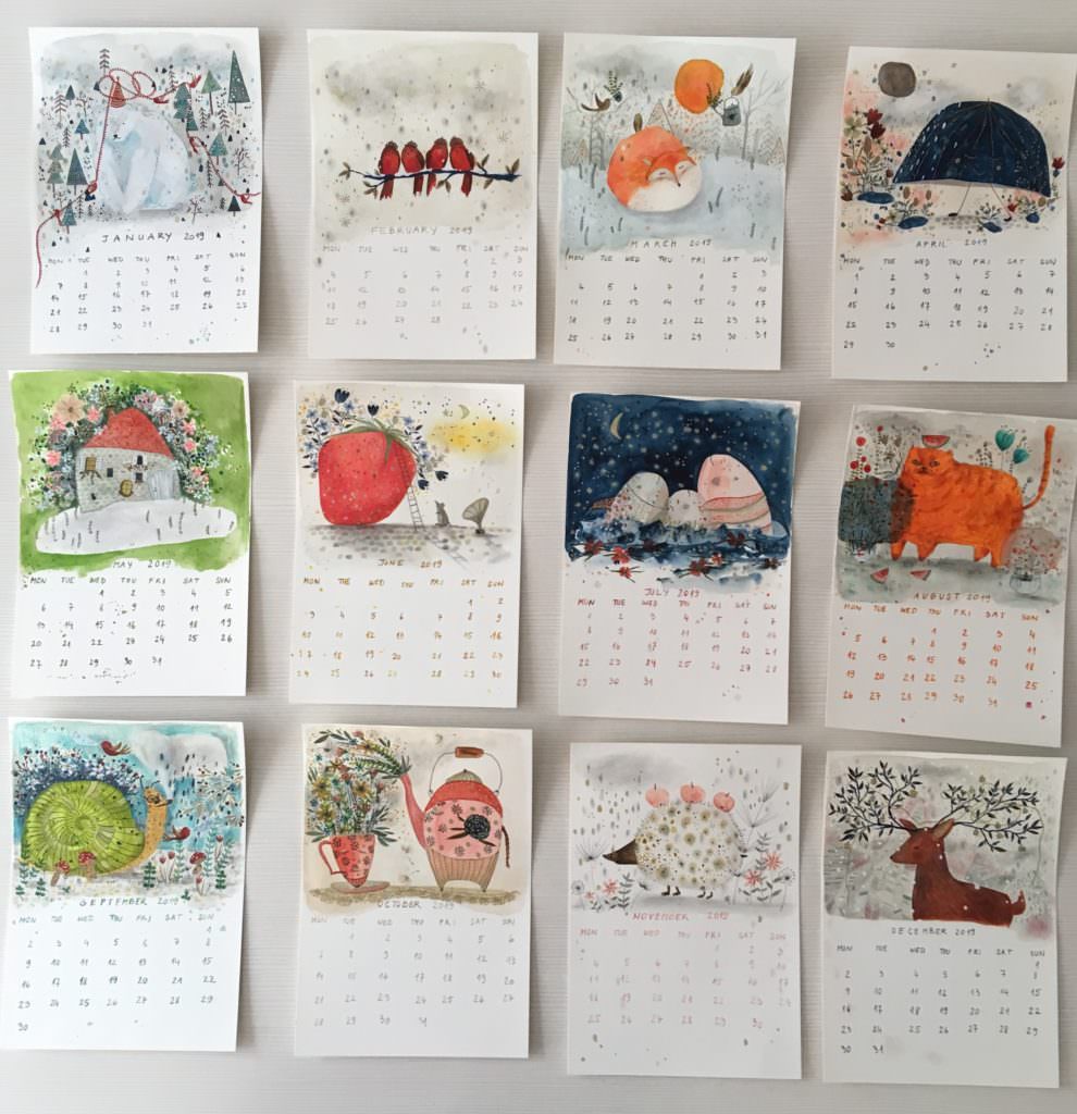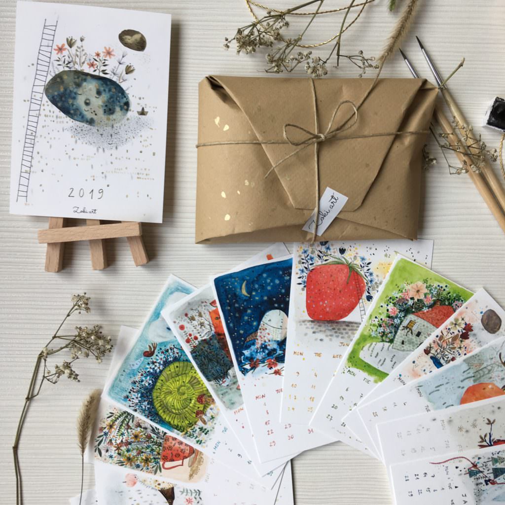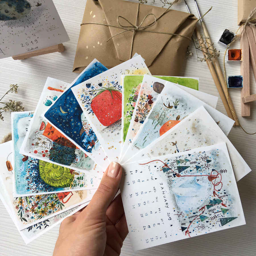 Desk calendar for 2019 with wooden easel stand is a chic must-have on your desk. Each month with a special whimsy illustration that I painted to brighten your day. I made original illustrations in watercolour technique. Also, each front page of the calendar has small golden additions painted by hand.