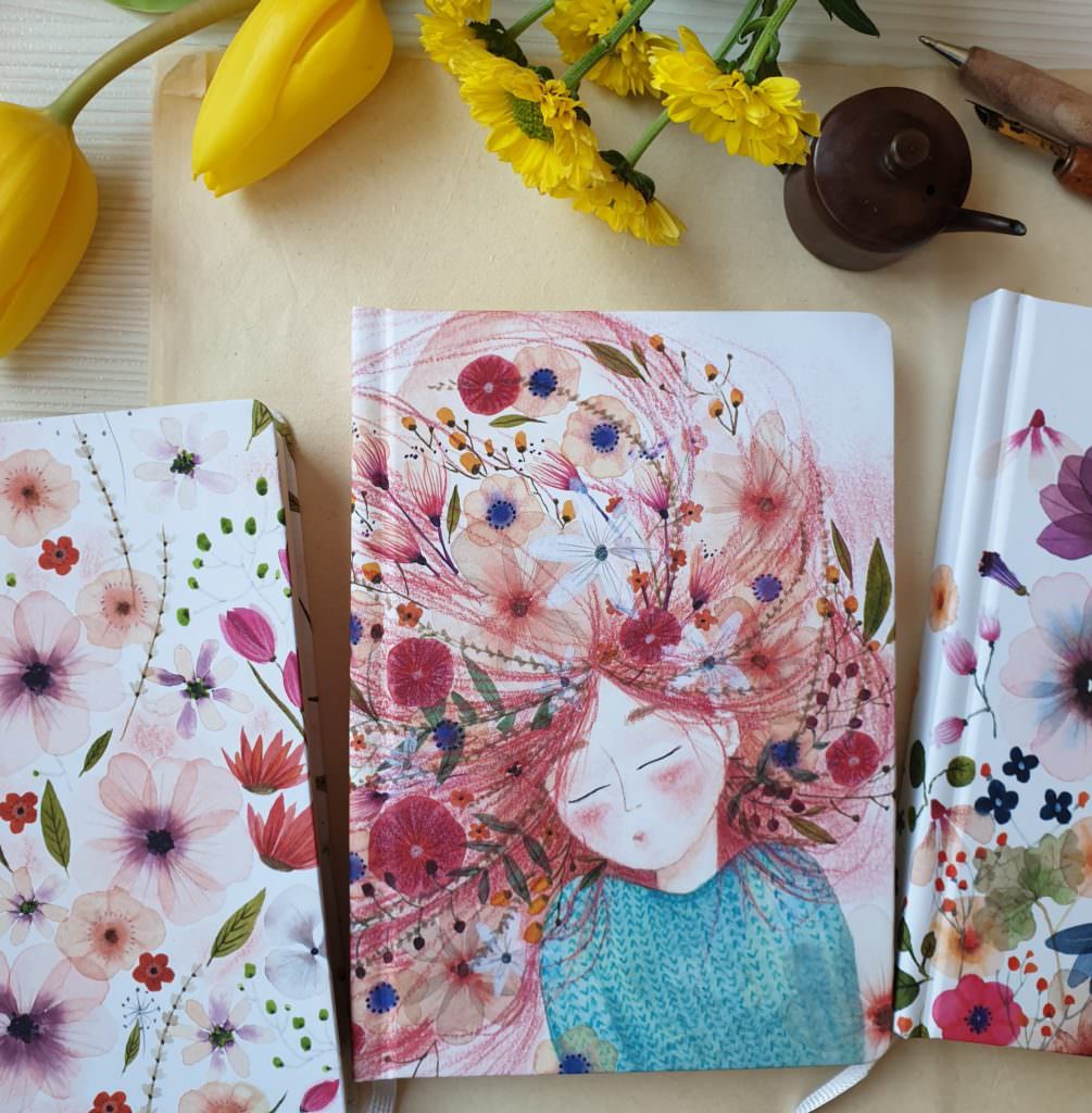 The challenge I have set for myself this time was the selection of motifs that resemble children’s illustrations. I have picked solely flowery motifs that are, in a narrative sense, less specific and thus more interesting for the public. Therefore, two motifs have been created which have only flowers in different warm and feminine color shades. Well, with the exception of one motif where I simply couldn’t resist the temptation of putting a few flowers into the hair of a dreamy little girl. All three motifs were then printed on hardcover jotters. I decided to leave the interior blank and in this way leave some room for creativity since one can actually use it as a notebook, diary, small recipe jotter or even a sketchbook.