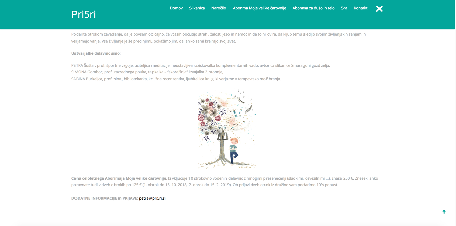 I have already worked with Petra Šuštar on the Emerald Forest picture book but we will surely work together again in the future. She asked me to do a few graphics for her web site and marketing campaigns. Since she also practices yoga, organises various workshops for women, teaches meditation, and keeps the young ones active with activities as well, we decided to improve her web site visually with 4 illustrations which resemble those in Emerald Forest and will therefore make sure Petra’s site will be more recognisable.