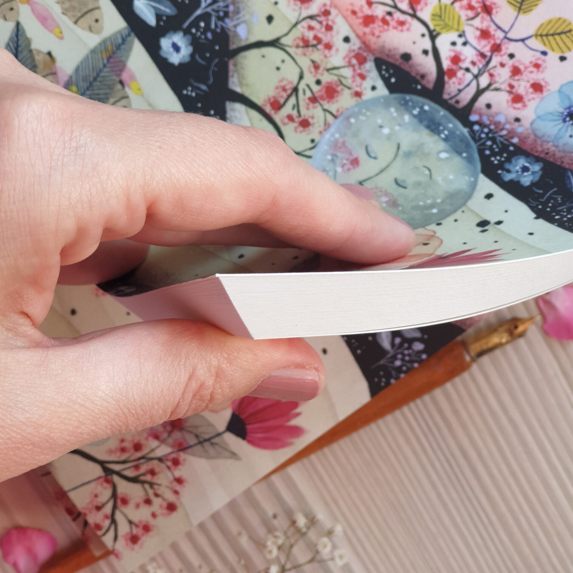 Beležka meri 16×16 cm in vsebuje 80 brezčrtnih listov debeline 120 gsm. Platince beležke so ”soft touch”. Tiskana je na visoko kakovosten, recikliran papir. Zaradi debeline listov se črnilo lepo vpije v papir in ne pušča sledi na hrbtni strani.