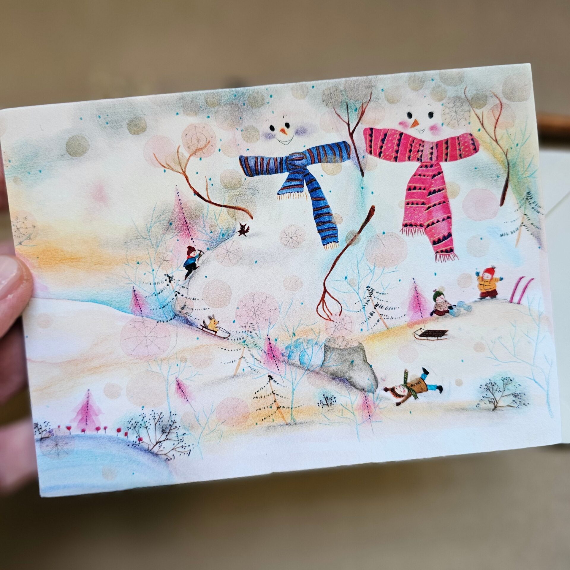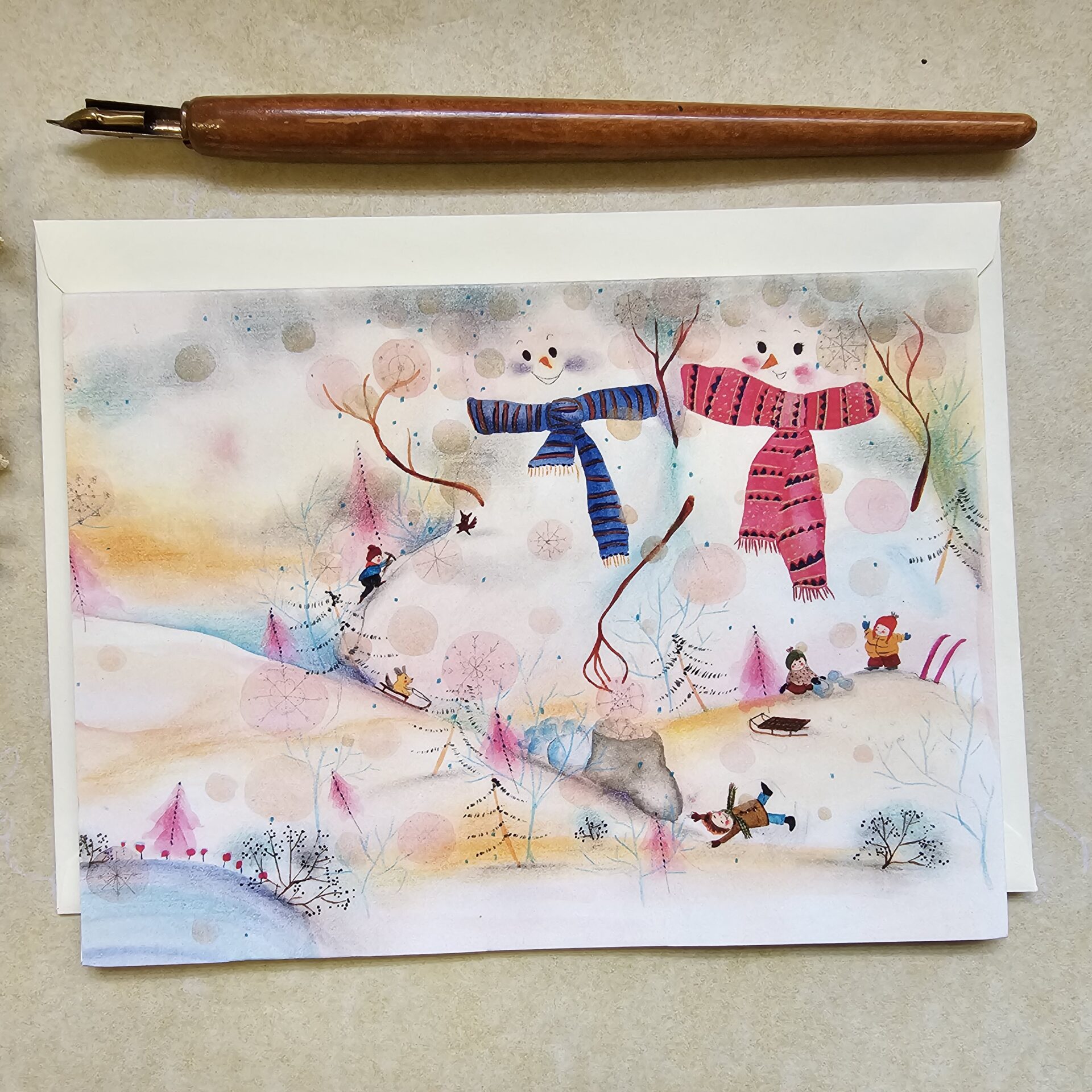 Voščilnica ”Snežna zabava” je reprodukcija originalne ilustracije naslikane v tehniki akvarel, gvaš in barvni svinčniki. Voščilnica je tiskana na recikliran, 300 g papir v velikosti 150×110 mm. Notranjost voščilnice je prazna. Priloženo ima kuverto. Zapakirana je v prozorno celofan vrečko za zaščito.