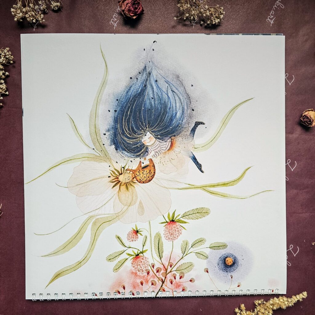 Tamali, namizni je pa 15×15, odpre se na trikotnik in je uporaben z obeh strani. Na eni strani je povdarek na ilustraciji. Ta ima diskretne datume. Na drugi strani pa je povdarek na datumih in je ilustracija manjša. Pride čist hud dodatek na pisalni mizi. oz. kamorkoli ga boš postavila, bo prostor presvetljen z nadnaravno svetlobo.