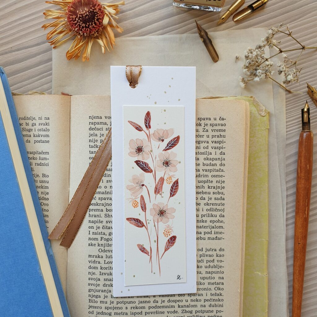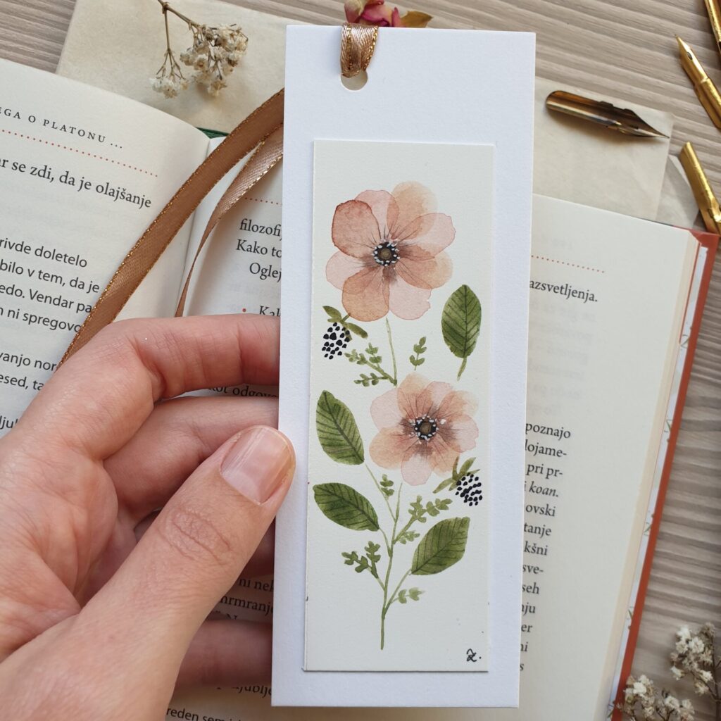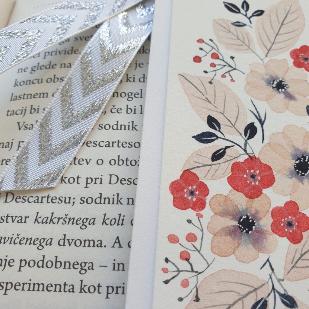 Narisala sem ljubko, majhno sliko z rožami in jo prilepila na lep, bel karton. Za piko na i sem na vrhu naredila še luknjico in jo okrasila s svetlečim satenastim trakom. Po več kot letu dni me še vedno navduši in si ga z veseljem ogledam vsakič, ko vzamem v roke knjigo.