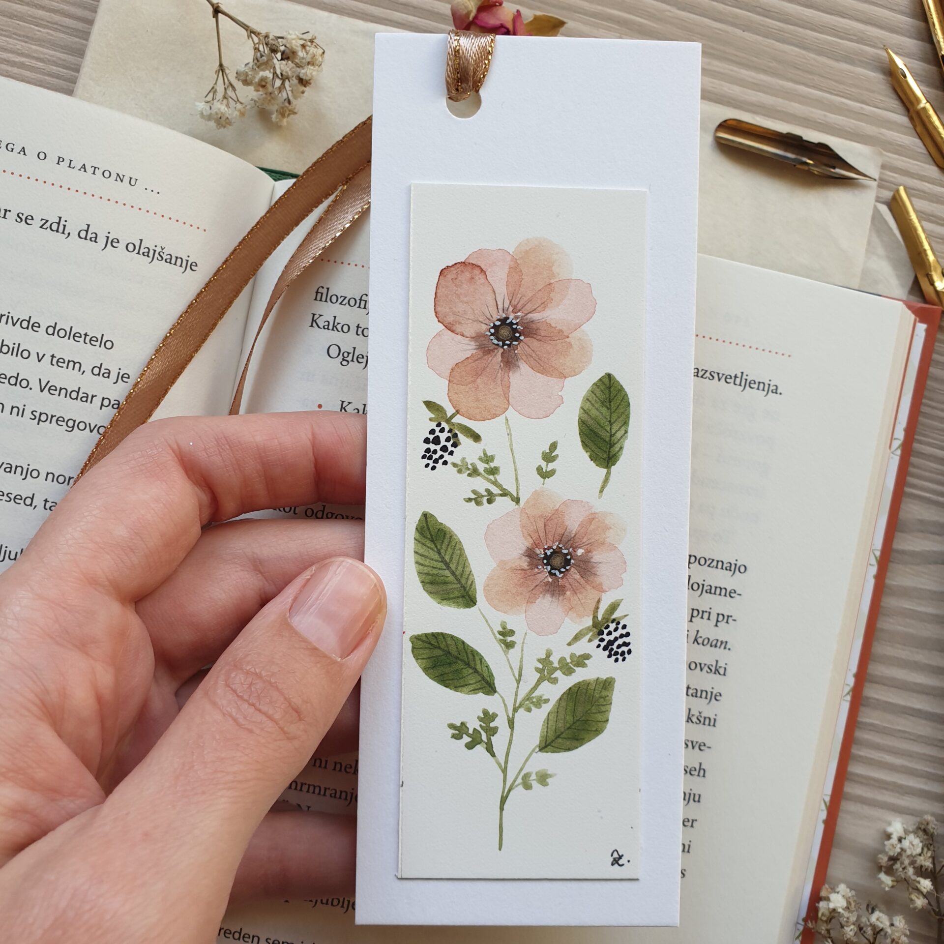 Narisala sem ljubko, majhno sliko z rožami in jo prilepila na lep, bel karton. Za piko na i sem na vrhu naredila še luknjico in jo okrasila s svetlečim satenastim trakom. Po več kot letu dni me še vedno navduši in si ga z veseljem ogledam vsakič, ko vzamem v roke knjigo.