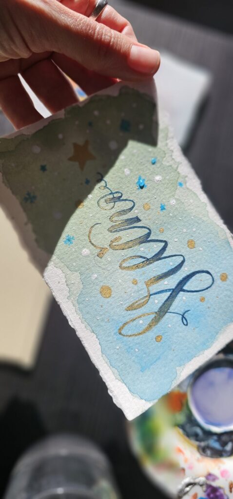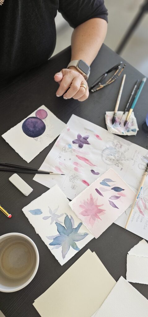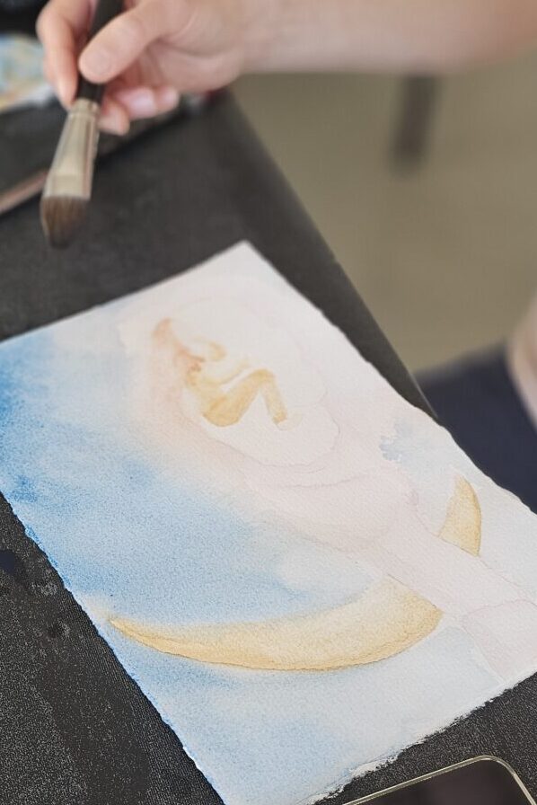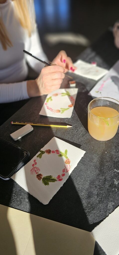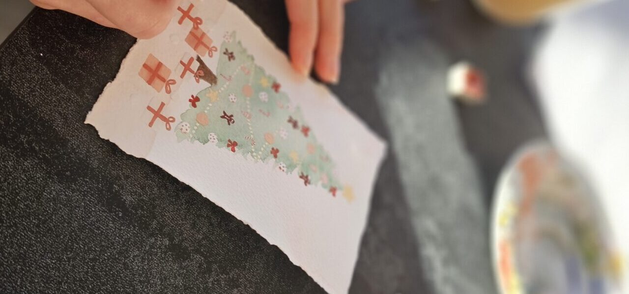 Na zadnji delavnici letos smo ustvarjale voščilnice in knjižna kazala – brez bleščic in zlate barve seveda ni šlo! 🪩✨ Kot vedno je bila osrednja nit slikanje na način Zoki.art ilustracij: plastenje slojev vode in nežnih pigmentov. Preprosti in mili liki z rahločutnim dekorjem. Prepustile smo se procesu in uživale v prelivanju vode ter v mehkobi in unikatnosti akvarela. Na delavnicah se nikoli ne gremo klasičnega akvarelnega slikarstva. Tega jaz pač ne znam. Možgani mi nečejo delat tako. Zato vedno raje popeljem moje punce skozi svoj način dela. Skupaj odkrivamo čar ustvarjanja, se pogovarjamo s svojim notranjim otrokom in prevajamo njegovo govorico na sproščen in intuitiven način na slikarsko podlago. Tudi tokrat je bilo tako.