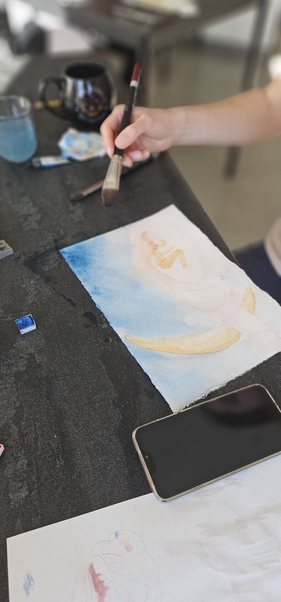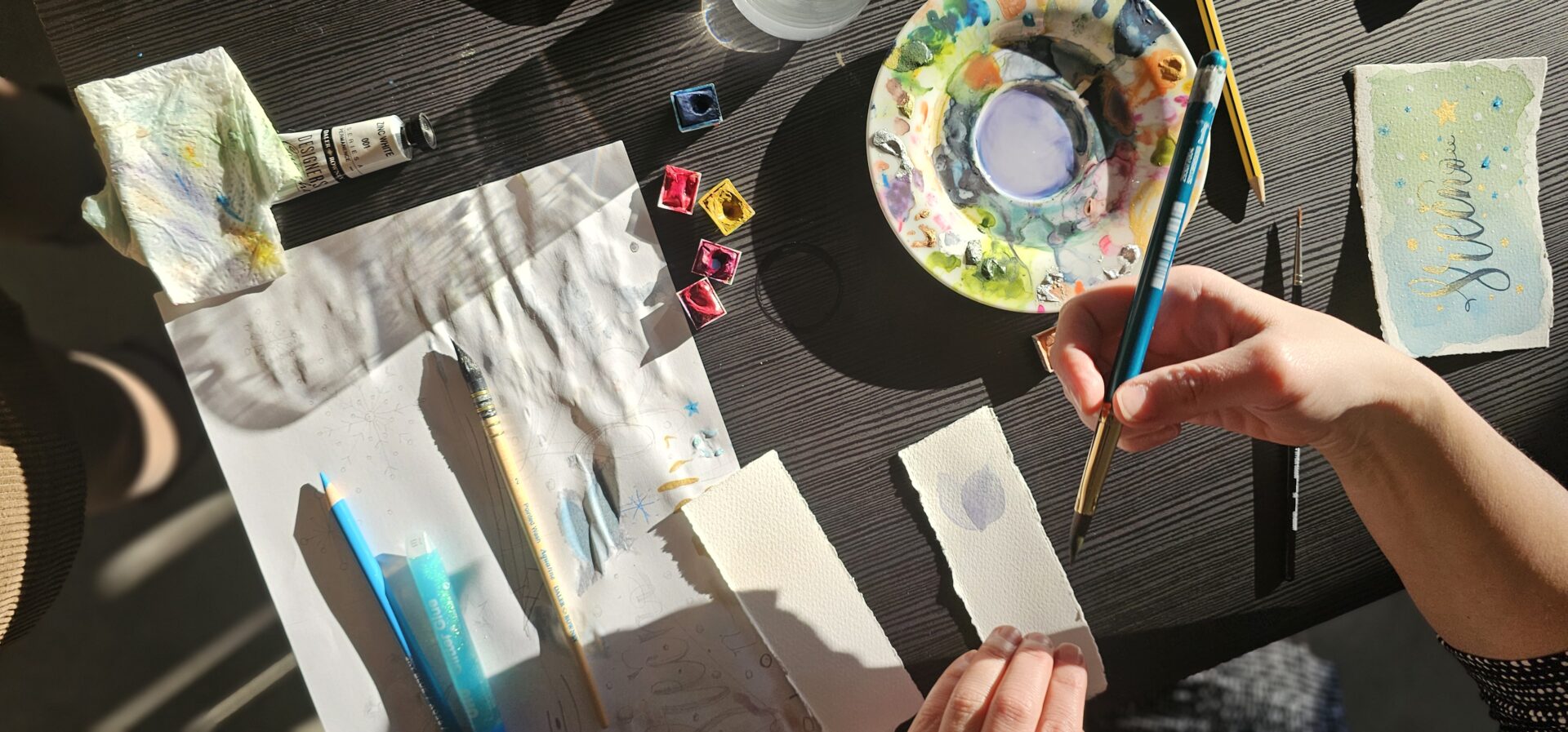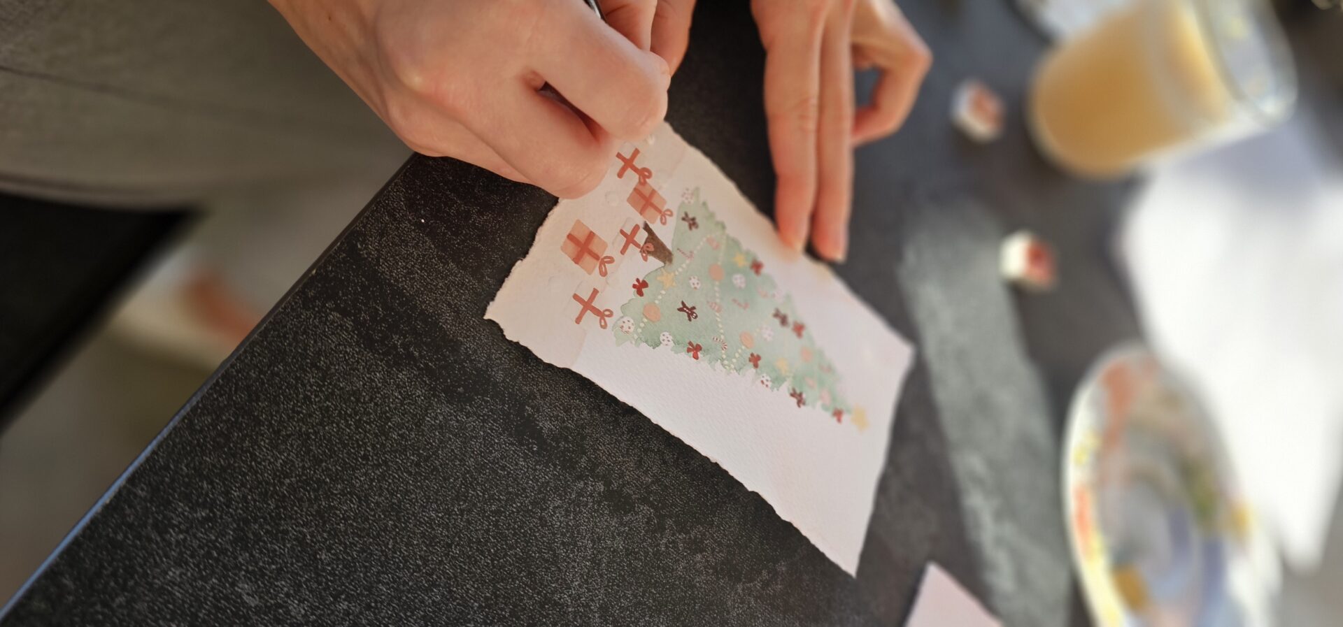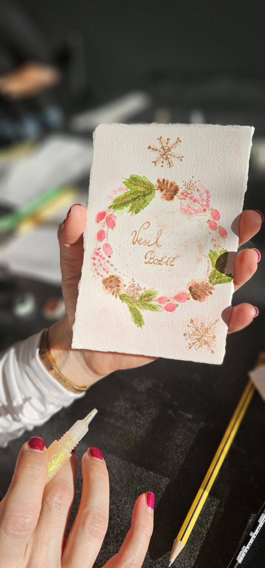 Na zadnji delavnici letos smo ustvarjale voščilnice in knjižna kazala – brez bleščic in zlate barve seveda ni šlo! 🪩✨ Kot vedno je bila osrednja nit slikanje na način Zoki.art ilustracij: plastenje slojev vode in nežnih pigmentov. Preprosti in mili liki z rahločutnim dekorjem. Prepustile smo se procesu in uživale v prelivanju vode ter v mehkobi in unikatnosti akvarela. Na delavnicah se nikoli ne gremo klasičnega akvarelnega slikarstva. Tega jaz pač ne znam. Možgani mi nečejo delat tako. Zato vedno raje popeljem moje punce skozi svoj način dela. Skupaj odkrivamo čar ustvarjanja, se pogovarjamo s svojim notranjim otrokom in prevajamo njegovo govorico na sproščen in intuitiven način na slikarsko podlago. Tudi tokrat je bilo tako.
